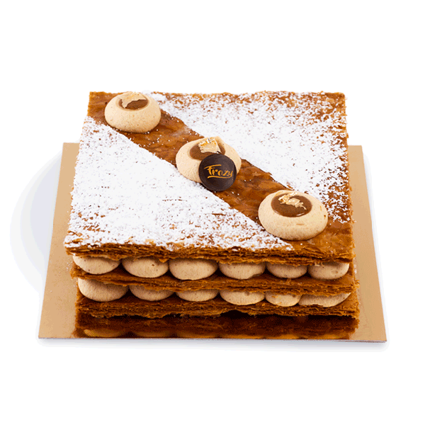 Pâte feuilletée croustillante pur beurre, mousse praliné noisettes, noisettes fraîches concassées, caramel beurre salé.